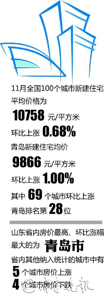 根据最新出炉的中国房地产指数系统百城价格指数,全国100个城市新建住宅的样本调查数据显示,今年11月,全国100个城市新建住宅平均价格为10758元/平方米,环比上涨0.68%,自去年6月以来连续第18个月环比上涨,涨幅比上月降0.56%,为今年以来最低水平,其中69个城市环比上涨,31个城市环比下跌。青岛11月新建住宅均价9866元/平方米,环比上涨1%,在房价环比上涨的69个城市中排名第28位,这是下半年以来青岛房价连续第四个月上涨,并且11月房价已经攀至全年最高水平。