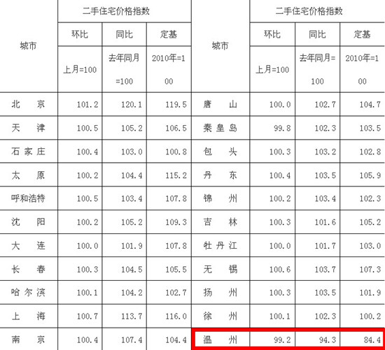 根据国家统计局的数据显示,11月份70个大中城市中,新建商品住宅(不含保障性住房)价格环比、同比下降的城市只有温州一个,分别下降了0.5%和1.2%。而二手住宅价格同比下降的城市也仅为温州,下降了5.7%;环比下降的两个城市中,温州的降幅最大,为下降0.8%。(中新网房产频道)