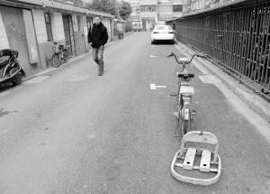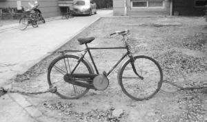 记者大略一看,小区空地上分布着不少自行车,再定睛一看,几乎道路上所有自行车的车身上都被拴上了锁、或着链条,连接着地锁。