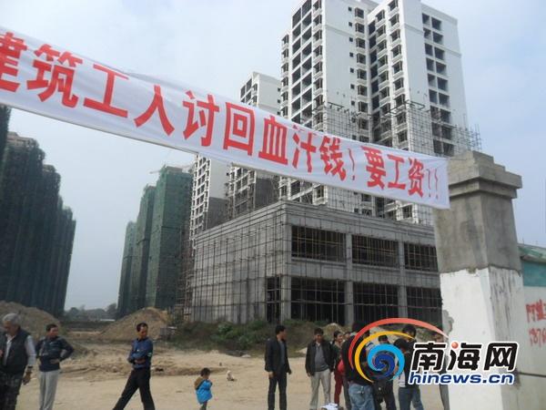 在海口市新大洲大道的香江豪庭工地,不少民工皆集聚在此讨要自己的工钱。(南海网记者孙令正摄)