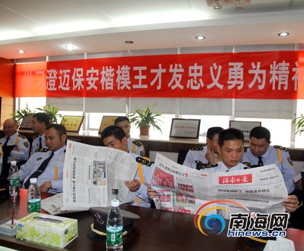 1月4日至6日,海南澄迈县委、县政府组织宣讲队伍,赴广州、深圳等地,向澄迈籍外出务工群体宣讲王才发勇斗歹徒的英雄事迹,并送去新春慰问,图为澄迈籍保安通过报道了解王才发的事迹,学习他见义勇为的精神。(南海网记者 李晓梅 通讯员 王家专 摄)