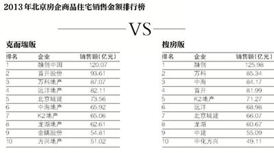 在克而瑞2013年北京房企商品住宅销售排行榜上,中海地产以65.92亿元的销售额排名第六;而在搜房网数据监控中心发布的榜单上,中海地产以84.17亿元的销售额排名第三。中海地产的销售额和排名是两家榜单中差别较大的一例。