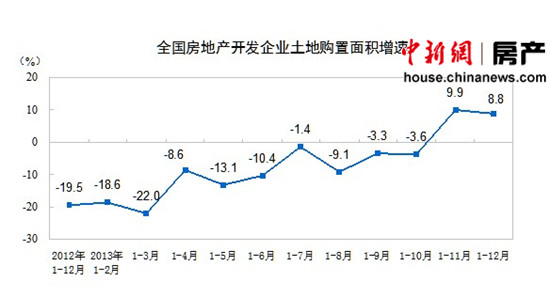 2013年,房地产开发企业土地购置面积38814万平方米,比上年增长8.8%,增速比1-11月份回落1.1个百分点;土地成交价款9918亿元,增长33.9%,增速提高2.4个百分点。
