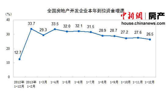 2013年,房地产开发企业到位资金122122亿元,比上年增长26.5%,增速比1-11月份回落1.1个百分点,比2012年提高13.8个百分点。其中,国内贷款19673亿元,增长33.1%;利用外资534亿元,增长32.8%;自筹资金47425亿元,增长21.3%;其他资金54491亿元,增长28.9%。在其他资金中,定金及预收款34499亿元,增长29.9%;个人按揭贷款14033亿元,增长33.3%。