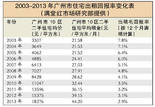 在广州二手市场上,像冯女士这样以收租为生的“收租婆”、“收租公”为数不少,除了退休的老人外,也有不少年轻人以此为“副业”。不过,随着楼价的上涨,广州二手租赁回报率也逐渐下降。根据满堂红10年来的数据显示,2003年广州二租赁市场租金为21.58元/平方米/月,10年后为44.2元/平方米/月,比2003年上涨100%以上,比2012年上涨12.9%,而租金回报率却从2003年的7.8%跌至如今的2.9%,首度跌破3%。与此同时,2013年二手住宅均价同比上涨18.9%。