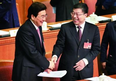 上午,大会闭幕后,市委书记郭金龙与市人大常委会主任杜德印握手 摄/记者 付丁