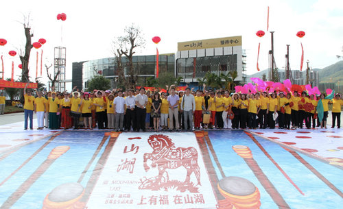 在活动现场三亚一山湖,现场(达)到80平方米的3D彩绘马格外醒目,万名老百姓排成整齐的队列,在音乐的指挥下,脚步齐整地跳起了万人舞,这种“马上有福”的寓意吸引了众多游客围观并(合影)。万人舞以火爆的“骑马舞”开场,在观众的叫好声中,以“开门红”步入高潮,最后在“好日子”的寄盼下结束,令新春佳节喜气洋洋。