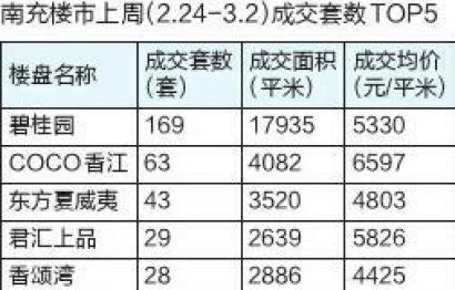 看了整体成交均价,再看上周南充楼市成交排行榜。位于嘉陵区的碧桂园,以169套的成交量摘得销售冠军,随后,是顺庆区的蓝光·COCO香江,成交63套,位于榜眼。而夺得上周南充楼市住宅成交排行榜探花位置的,则是位于高坪区的东方夏威夷,以43套成交量,成为高坪代表队的实力选手。顺庆区的君汇上品和高坪区的香颂湾两个项目则位于第四、第五。