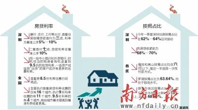 目前深圳楼市中已经很难找到基准以下的房贷利率了,如果购买首套房还能问到一个9.5折利率的放贷银行,那么算幸运了。记者日前分别从建行、农行、工行了解到,首套住房按揭贷款首付为三成,利率为基准上浮5%—10%;二套首付七成,贷款利率为基准上浮10%。而一些中小银行和外资银行,时机恰当的购房者还有机会拿到95折的放贷利率,如果是一些资产或信用优质的客户或许有更多的优惠利率。