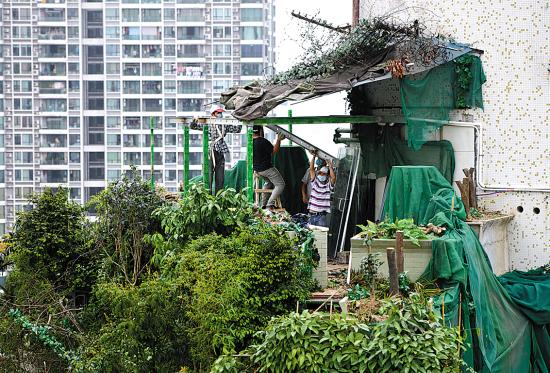 被称为“广州最牛违建”的天河北海棠阁“大绿帽”经媒体曝光后,业主于4月14日开始进行拆除。两个星期过去了,记者看到除了上层的玻璃温室及部分钢筋支架被拆除外,仍有大量植物未清除。不少市民认为“残留”的树木及钢架等或可能从高空坠落,存在较大安全隐患。