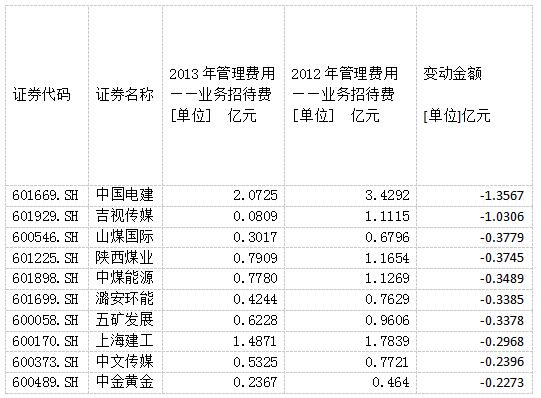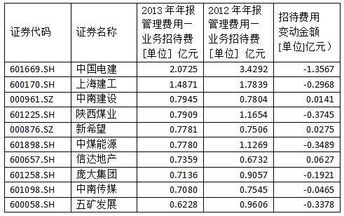 但值得一提的是,降幅前十名的企业中,有5家仍是2013年业务招待费最高的前十企业。例如,中国电建(601669.SH)虽然降幅居首,但仍以2.07亿元排在A股市场业务招待费榜首。