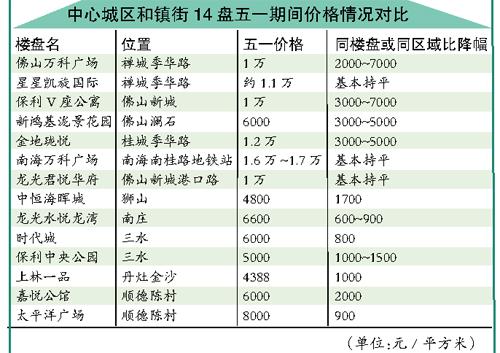 记者注意到,不同区域开发商选择的降价策略不同。在中心城区,大部分项目选择“抢跑”,即在五一之前就推货促销抢购房者。4月27日,佛山新城保利V座公寓以1万元/平方米的均价开盘,而此前全市公寓起价为1.3万元/平方米。