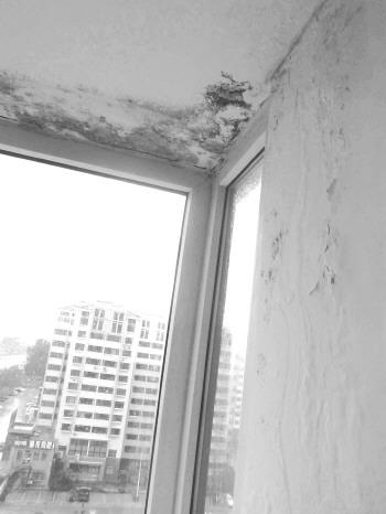 记者来到锦绣新城四期4号楼看到,楼里的住户不太多,但西北角的住户家里几乎家家窗台边的墙皮遭到浸泡。在15楼的住户家中,记者看到窗边的墙皮已经被泡得翘了起来,白净的墙面上出现了发霉的斑点。而在8楼的住户家中,整面墙已经布满了黑点。