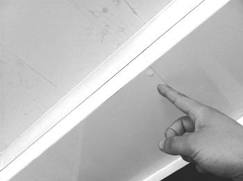 11日上午11点左右,记者在赵先生家中厨房看到,屋顶虽然已经不再滴水,但是厨房地面上垫着一块被水浸湿的抹布,屋顶上也有水珠,漏水后留下的痕迹很明显。