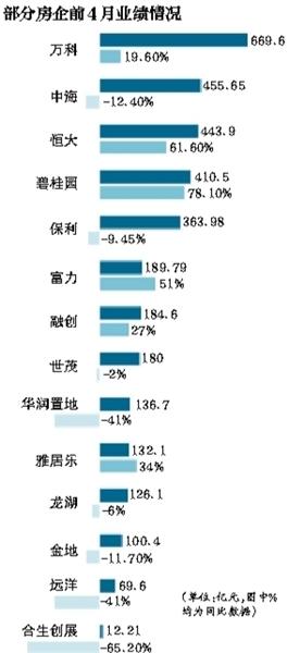从前4月的销售总额看,万科仍稳坐头把交椅,销售总额达669.6亿,同比去年前4月涨19.6%。中海地产紧随其后,达455.65亿,恒大为443.9亿,碧桂园为410.5亿。目前仅此四家房企前4月销售额超过400亿。