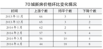 数据显示,4月份我国70个大中城市中,新建商品住宅(不含保障性住房)价格环比下降的城市有杭州、宁波、无锡、温州、金华、安庆、赣州、惠州等8个,比上月增加4个;持平的城市有18个,比上月增加8个;上涨的城市有44个,比上月减少12个。新建商品住宅价格出现上涨的城市个数进入“40”的区间,这是自2012年年底以来的首次。二手住宅价格环比下降的城市有22个,比上月增加8个;持平的城市有13个,比上月减少1个;上涨的城市有35个,比上月减少7个。