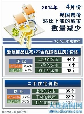 调查显示,4月份我国70个大中城市中,新建商品住宅和二手住宅价格环比上涨的城市个数分别为44个和35个,分别比上月减少了12个和7个;环比持平的城市个数为18个和13个,比上月增加了8个和减少了1个;环比下降的城市个数为8个和22个,比上月增加了4个和8个。