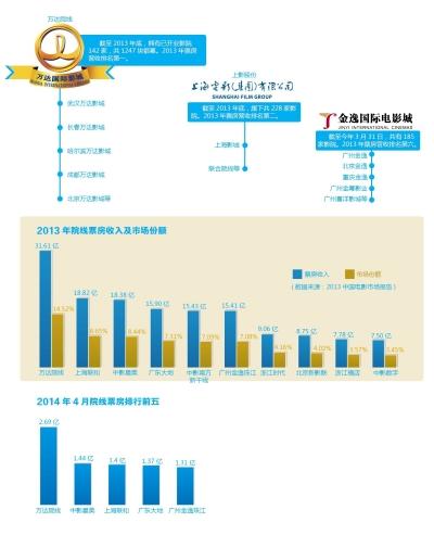 数据显示,截至2013年底,全国注册城市院线共46条,农村流动数字电影院线249条。城市院线中,29条院线年度票房超过1亿元,6条院线年度票房超过15亿元,成为第一梯队的竞争者,其中,万达院线以31.61亿元票房位于全国院线首位。具体来看,去年全年,前十大票房收入合计148.68亿元,占全国电影票房收入总额的68.3%,与2012年占比70%相比,下降2.26个百分点。