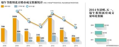 新京报讯 (记者陈禹铭)端午节小长假期间,北京楼市仍然延续了已持续数月的低迷态势。记者根据住建委官方网站数据统计,2014年端午小长假期间,北京市住宅网签套数共394套(其中新房254套、二手房140套),比2013年同期减少51.72%,创下了7年以来同期数据的最低值。