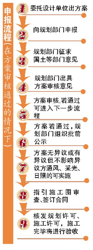 同时,规划方案在小区公示时间由原来的30天变为“不少于10天”,并预留5天作为意见收集期,即实际公示15天。随后,规划部门最快可在3个工作日内核发规划和施工许可,从申请人递交资料给规划部门到最终颁发施工许可,最快26个工作日即可走完流程。