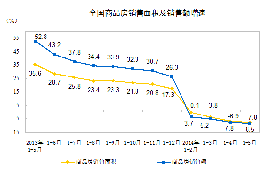 中新网6月13日电 6月13日下午国家统计局发布《2014年1-5月份全国房地产开发和销售情况》。报告显示,2014年前五月全国房地产开发投资30739亿元,同比上涨14.7%,增速有所放缓。前五月全国住宅销售面积下降9.2%,销售额下降10.2%。5月末,商品房待售面积53402万平方米,比4月末增加750万平方米。