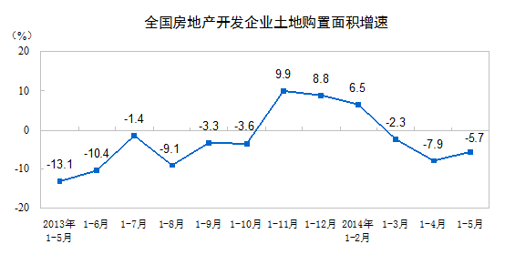 1-5月份,房地产开发企业土地购置面积11090万平方米,同比下降5.7%,降幅比1-4月份收窄2.2个百分点;土地成交价款2954亿元,增长8.7%,增速回落0.9个百分点。