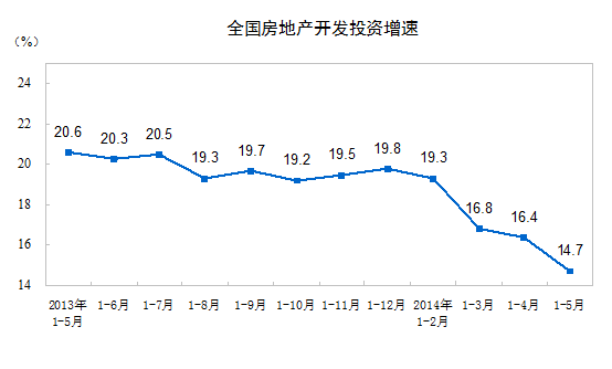 2014年1-5月份,全国房地产开发投资30739亿元,同比名义增长14.7%,增速比1-4月份回落1.7个百分点。其中,住宅投资21043亿元,增长14.6%,增速回落2个百分点,占房地产开发投资的比重为68.5%。