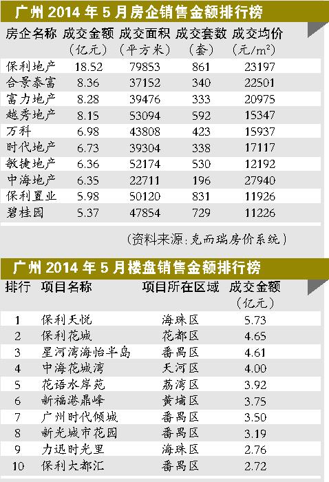 6月以来,开发商在一片降价潮中积极推货,据克而瑞整理的5月广州房企销售排行榜及项目排行榜显示,保利房地产获得了销售金额、销售面积和销售套数的三个第一名。这主要得益于保利天悦(保利琶洲湾)和保利大都汇两大项目的贡献。