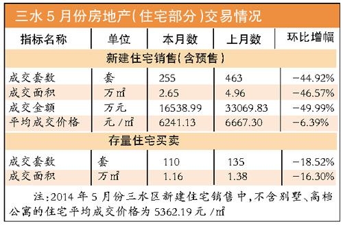备受关注的普通住宅成交均价(不含别墅、高档公寓),5月统计数据表明降幅在进一步加大。我们注意到三水4月该数据约为5780元/㎡,5月统计情况为5362.19元/㎡,降幅接近8%。不应忽视的是,该数据已出现连续两个月环比下降,4月普通住宅成交均价的降幅约为5%左右。
