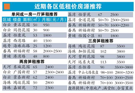 梁燕明表示,近期月租在600~1000元的租盘主要分布在花都等外围区域,而中心城区主要分布在白云区金沙洲、番禺区大石以及越秀、荔湾两区交界位置的少数楼梯楼小户型单位。据中原地产鸿运花园分行高级营业经理胡小玲介绍,赤岗一二三街的两房单位,面积约为50平方米,租金约为2000元/月起,两人合租很划算。如计划三人合租,可选择鸿运花园87平方米的楼梯三房单位,租金约3500元/月,预算略高一些。