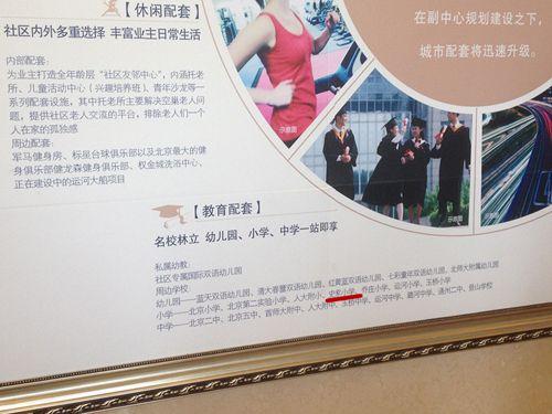 至今在售楼处宣传版上仍然在显著位置印有“名校资源”介绍,其中“附近小学”一栏中列有北京小学、北京实验二小、史家小学在内的7所小学,并未见发电厂小学。