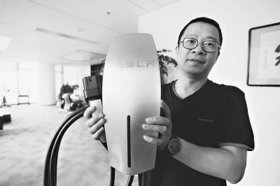 张珺向记者展示特斯拉的充电器。记者陈卓摄