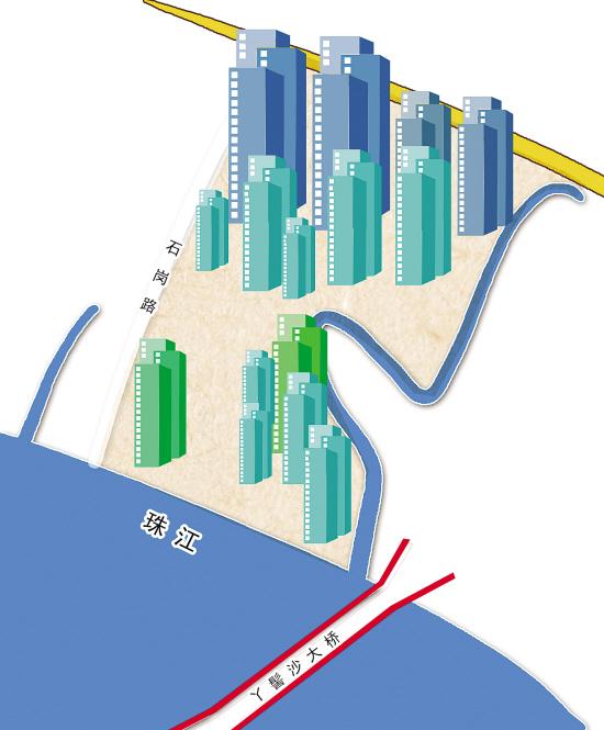 项目位于海珠区西部,广纸片区以东,南临珠江后航道,西接石岗路,东临石溪涌、北临石溪村,丫髻沙大桥从改造地块东南侧经过。改造地块总面积为33.17万平方米(497.5亩)。其中,广东轻工业机械有限公司、广州市水电设备安装有限公司、广州市珠江塑料制品厂三家全资国有企业用地面积为178810平方米,其余部分用地面积为152851平方米。