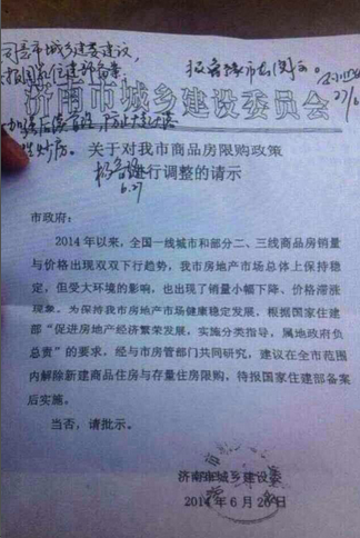 今天在网络上广泛流传一份显示为济南市建委发出的《关于对我市商品房限购政策进行调整的请示》文件内容称,济南市建委正在积极申请取消限购政策,待报国家住建部备案后实施。手写内容还显示有关批示:同意市城乡委的提议,并建议加强后续管理,防止本地市场出现大起大落及恶性炒房现象。(中新网房产频道)