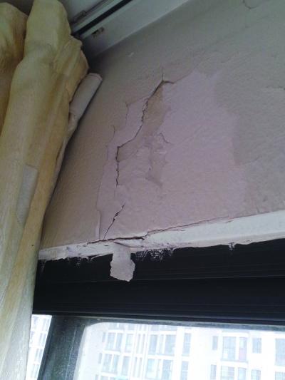 记者6日来到章先生的家里,首先看到的是,阳台上落着点点石灰,章先生说,每到雨多的季节,雨水不能顺着屋檐流淌下去,墙面都会出现泡裂的情况,很多白色石灰就从墙壁上落下来,这给生活带来了很大不便。