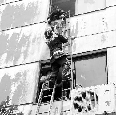 消防员借用拉梯悬空接力营救被困幼儿。通讯员张振摄