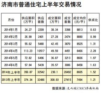 克而瑞(CRIC)济南机构数据显示,2014年上半年,济南市新建商品住宅(包括普通住宅和别墅)总成交套数为20580套,同比减少25.33%。