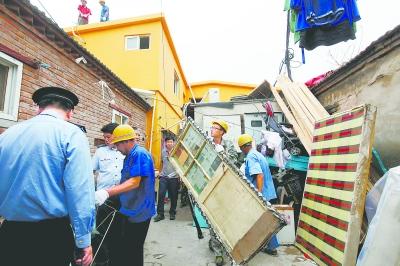 昨天上午8时许,建筑工人开始对房内进行清理,随后进行拆除。此次,将把二楼违建和东侧几间违建房一道拆除。大栅栏街道办事处综治办主任罗文介绍,在大栅栏地区,像小安澜营头条这种严重的违建群租楼还是首次出现。这处违建因为挨着旁边的住户太近,拆除难度非常大。工人只能在房内将隔断拆开,然后一块块吊下来,预计本周内基本拆完。(记者 金可)