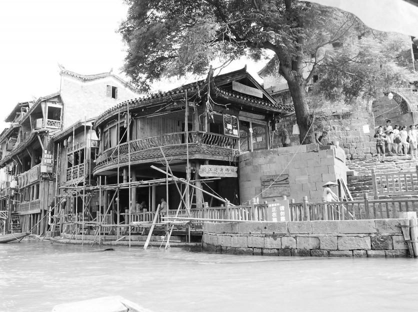 湖南凤凰古城修复受损吊脚楼建筑群