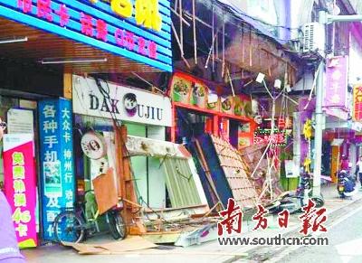 闹市街铺招牌忽塌险砸路人 或因木质材料不佳
