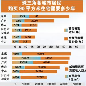 东莞城镇居民可支配收入全省最高,购房压力却并非最小。近日,省统计局发布62市经济数据,居民收入东莞居首为46594元,高于深圳、广州,但是按照东莞统计局最新公布的8月份新建住宅均价9105元/平方米计算,个人购买一套90平方米的普通住宅首付平均需要5.27年,一次性付完全款需要17.59年,在与广州、深圳、佛山、中山、江门等珠三角城市对比当中,购房压力排名第二位。