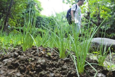 居民种在绿化带里的蔬菜苗。