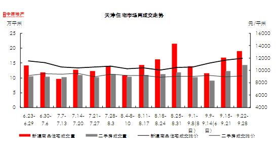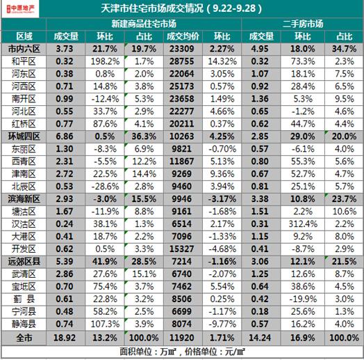 经天津中原投资顾问部对房管局公布的数据进行统计,上周(9月22-28日)天津新建商品住宅共成交1658套,成交面积18.9万平米,环比前一周增加13%,成交均价11962元/平米,环比前一周上涨2%。二手住宅成交1619套,成交面积14.2万平米,环比上一周增加16%。
