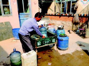 8日上午,记者来到村民邢孝伟家中时,他刚刚从外面拉水回来,一辆人力三轮车后面拉着几个塑料桶,这些水大概可以供一家人吃两天。取水的地方就在他家门前新盖起的小区附近,在那里有一个平时露着的水龙头。