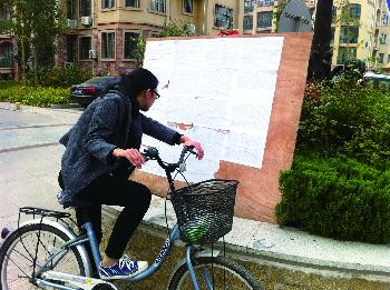 城区一小区内,业主正在看物业贴出的供暖收费通知。 本报记者 张召旭 摄