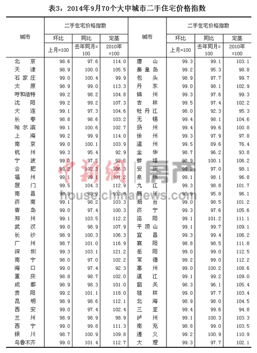 与去年同月相比,70个大中城市中,价格下降的城市有52个,持平的城市有1个,上涨的城市有17个。9月份,同比价格变动中,最高涨幅为4.3%,最低为下降10.4%。(中新网房产频道)