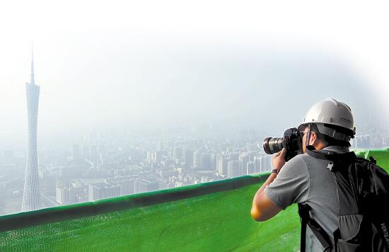 ■媒体记者在东塔上遥望广州塔,拍下照片。