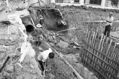 据介绍,事发后2个工地都积极配合工人进行抽水和抢修。记者在塌方的酒店工地施工现场看到,在其西侧事发现场,工人正在抢修自来水管。一工人表示,抢修完工最少要两三天时间。而距离该工地几十米处,市政排水工地现场一名工人告诉记者,“上面要求今晚修好,但估计很难,由于泥土松软,施工难度有点大。”