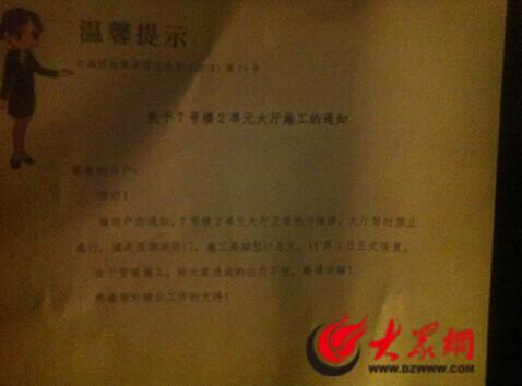 7号楼业主陈先生向大众网记者反映,中海国际社区2013年10月14日交付业主,今年是供暖的第一年。眼看着到了供暖季,业主早早交了取暖费等待供暖,可谁知却等来了物业的一张施工通知单。