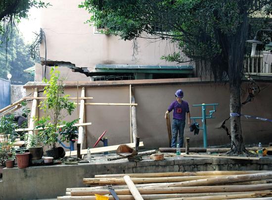■昨日,抢修工人用木头支撑开裂倾斜的墙体,以防止其继续下陷。